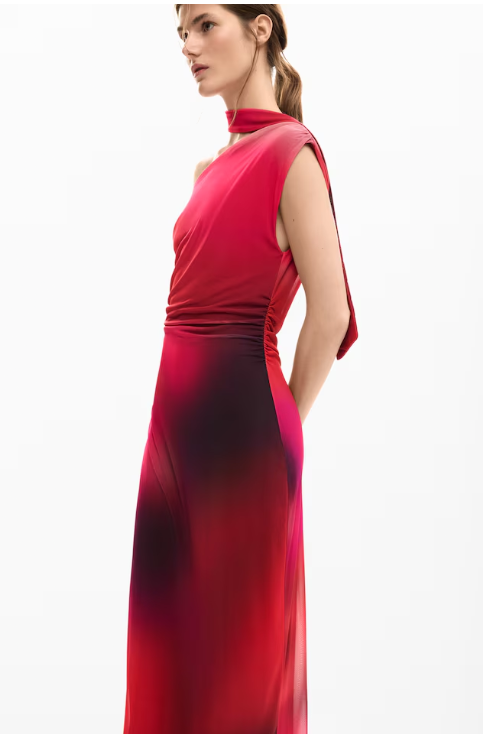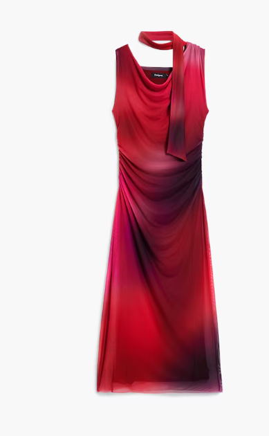 Perfect for Valentine’s Day and beyond, this stunning Desigual dress is all about romance with an artistic edge. Designed in rich red and wine tones, this sleeveless fitted silhouette is crafted from soft, stretchy mesh that hugs your curves while staying comfortable. The signature attached scarf detail adds drama and movement, making this piece effortlessly eye-catching and unforgettable.