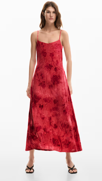 Perfect for Valentine’s Day, this Desigual midi dress brings effortless romance with a bold artistic twist. Designed with delicate spaghetti straps and a flattering long midi length, this dress features a soft pink base accented with rich burgundy print. Crafted from stretchy fabric, it hugs comfortably while allowing easy movement, making it ideal for day-to-night wear.