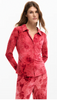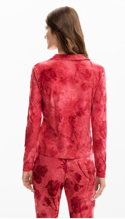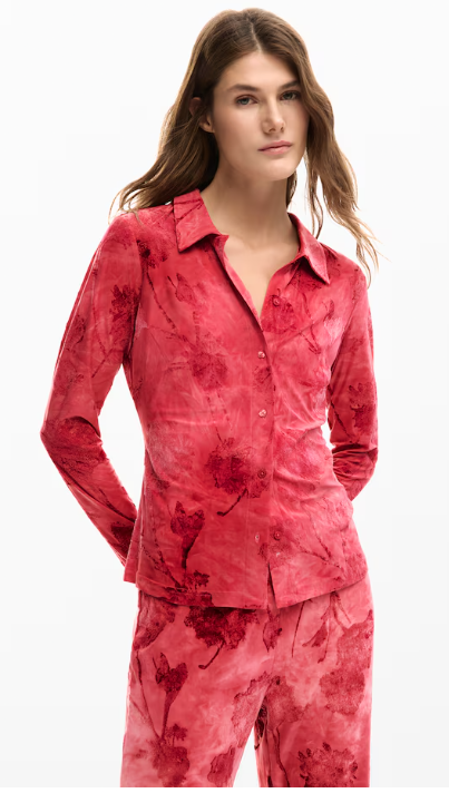 Designed in soft pink and rich wine tones, the bold signature print makes a statement while the stretch fabric ensures a comfortable, flattering fit. The classic button-down silhouette is elevated with Desigual’s playful, modern edge—easy to dress up or down.